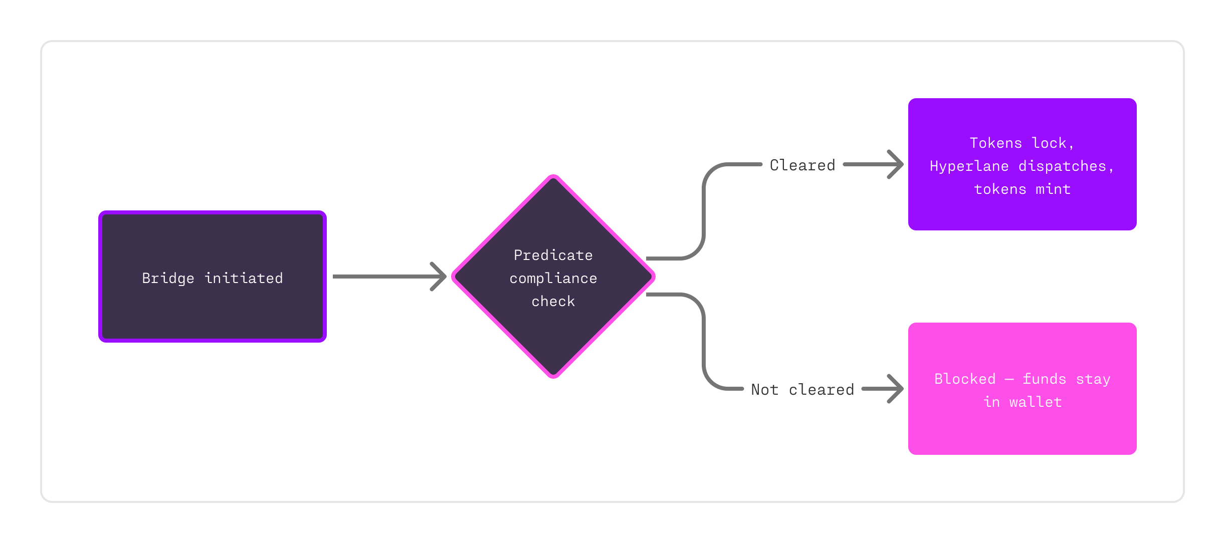 This only works because of how Hooks are built. They're an extensibility mechanism in Hyperlane's message dispatch flow, meaning chains can inject custom logic (like compliance checks) into the bridging process without modifying the core protocol. Adding a Predicate Hook to a Warp Route is a configuration choice. Not a fork, not a custom deployment, not a six-month integration project.